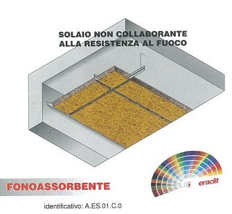 Controsoffitto antincendio denominato ERACUSTIC-S, certificato REI 60, conformemente al certificato n. CS10482RF, termofonoisolante e fonoassorbente, costituito da lastre Supalux-S omologate dal Ministero dell'Interno in Classe 0 di reazione al fuoco, in calcio silicato idrato rinforzato con fibre di cellulosa ed additivi inorganici, esenti da amianto ed altre fibre inorganiche, aventi il lato a vista reso fonoassorbente con pannelli Eracustic (-M) in lana di legno mineralizzata con magnesite ad alta temperatura, con fibra sottile a grana acustica conformi alla norma UNI 9714-M-A-F, omologati in Classe 1 di reazione al fuoco, preverniciati sulla faccia a vista con pittura lavabile; i pannelli hanno spessore totale 31mm, dimensioni mm 6000x1200, bordi ribassati.