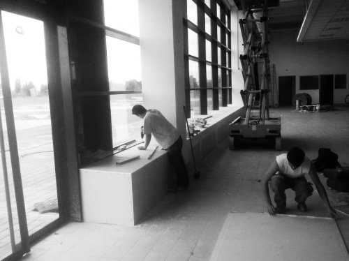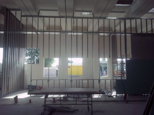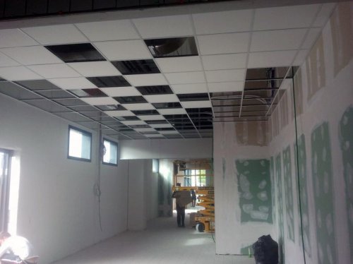 Realizzate le pareti in cartongesso e i controsoffitti a pannelli ispezionabili 60x60cm di tutto il punto vendita.