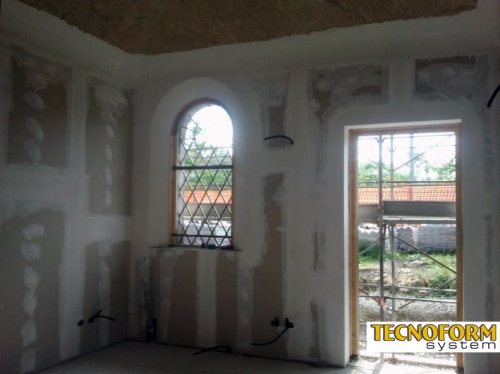 Ristrutturazione interna della villa con contropareti in cartongesso con barriera vapore, velette e controsoffitti antincendio REI a protezione dei solai in legno.