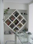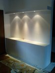 In una abitazione del centro storico di Ferrara in fase di ristrutturazione abbiamo realizzato alcuni mobili in cartongesso tra cui una libreria in diagonale e un mobile porta TV e videoregistratore.
